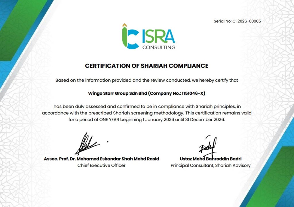 We are proud to announce that Wingo Starr Group Sdn Bhd has been officially awarded a Shariah Compliance Certificate by ISRA Consulting, under INCEIF (International Centre for Education in Islamic Finance). INCEIF, also known as INCEIF University, is owned and established by Bank Negara Malaysia (BNM) and is a globally recognised authority in Islamic finance education and advisory. This certification reflects our strong commitment to ethical, transparent, and Shariah-compliant business practices, and marks an important milestone in our corporate governance journey.